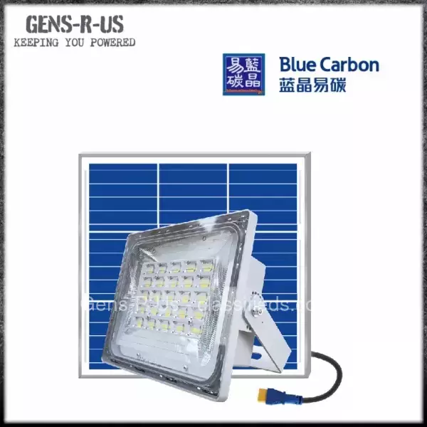 Blue Carbon 60W 5000-Lumen LED Solar Flood Light WaWa Light 6.0; 120W Solar Panel, 65Ah Lithium Battery, IP65 Waterproof, Auto Dusk-to-Dawn Operation, Remote Control